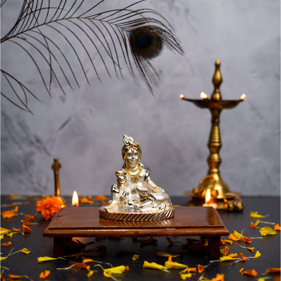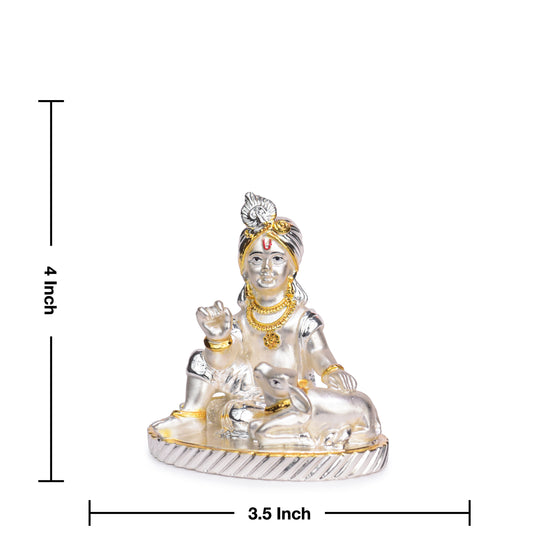 Ladoo Gopal Krishna with Cow Idol for Home Decor 24K Gold and 999 Silver Plated Sculpture of Krishna for Home, Office, Temple and Table Decoration Gift